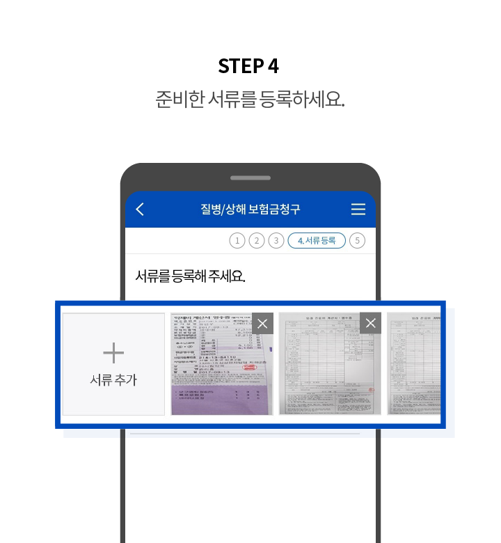 STEP 4 : 준비한 서류를 등록합니다. '서류 추가' 버튼을 클릭하여 필요한 파일을 업로드합니다.